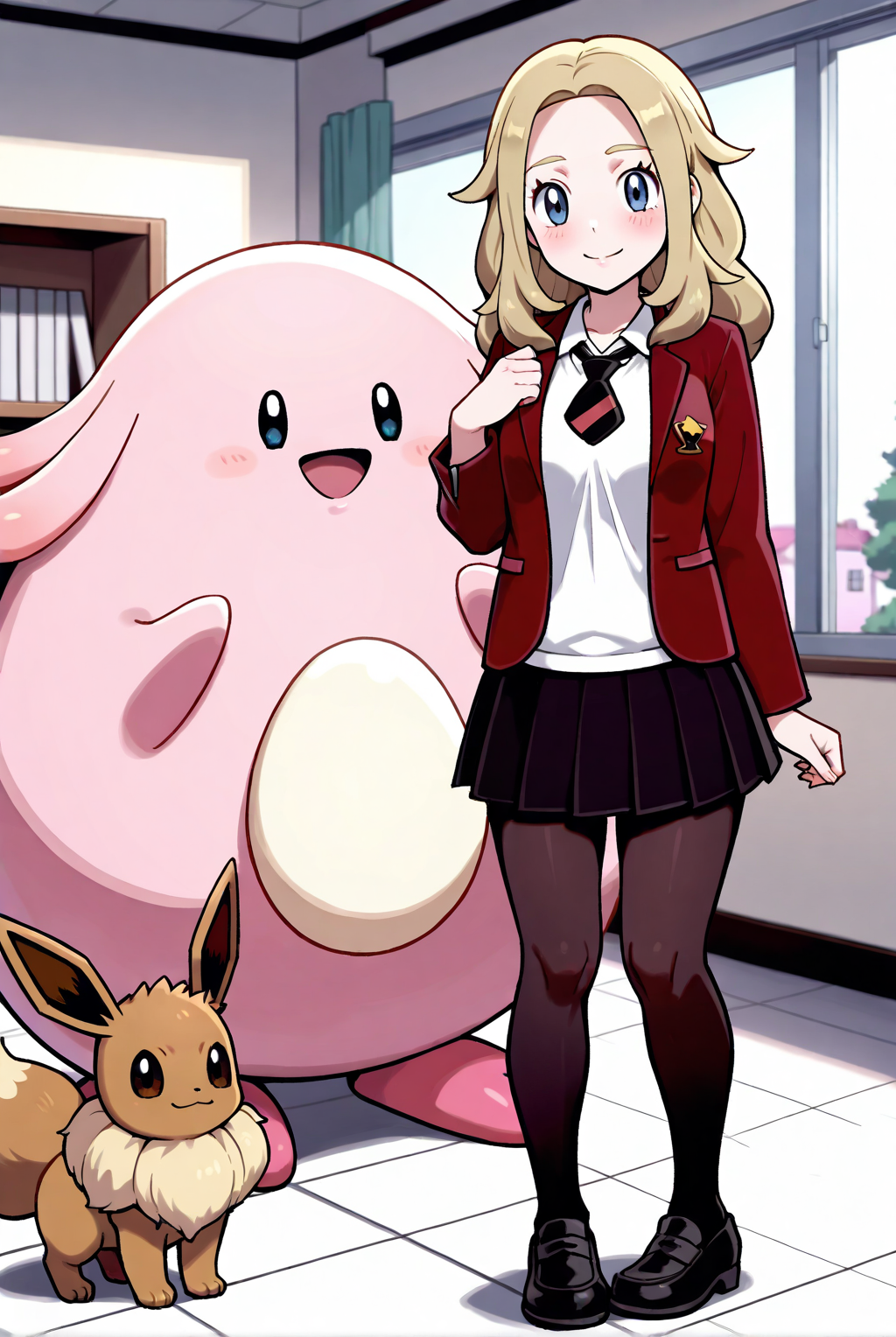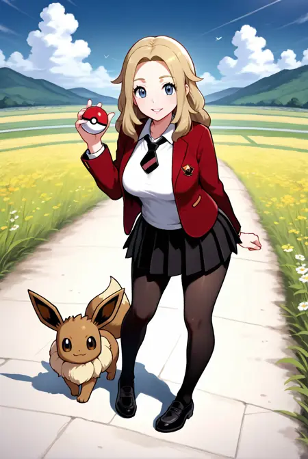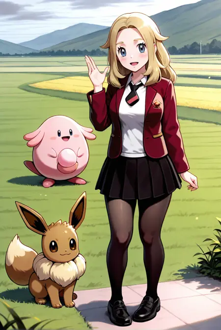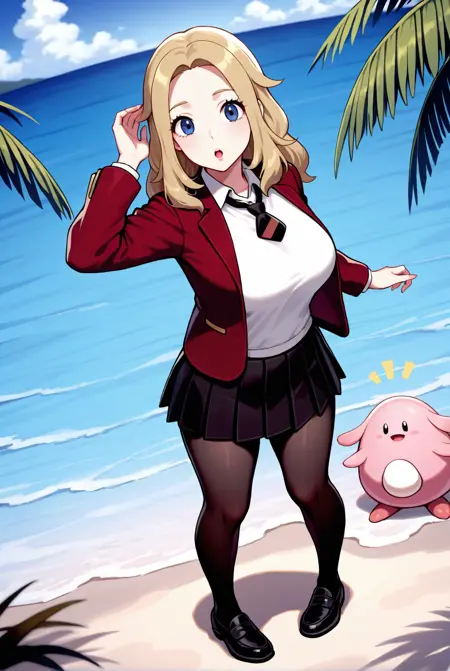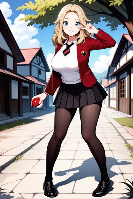 | 训练词汇 | Lass, long hair, blonde hair, parted bangs, blue eyes, school uniform, white shirt, open jacket, pleated skirt, collared shirt, black skirt, miniskirt, black footwear, black pantyhose, eyelashes, blazer, loafers, black necktie, red jacket, short necktie已复制! |