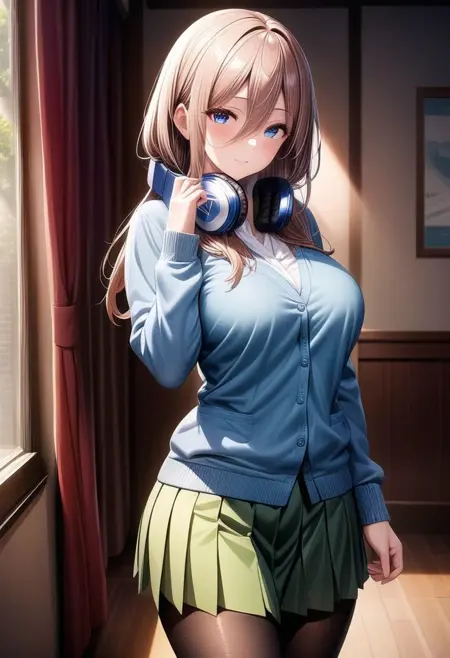 트리거 단어: miku_a_xl, 긴 머리, 갈색 머리, 파란 눈, 눈 사이의 머리카락, 큰 가슴, 헤드폰, 목에 감긴 헤드폰, 학교 유니폼, 긴 소매, 파란 카디건, 셔츠, 흰 셔츠, 녹색 치마, 팬티스타킹, 검은 팬티스타킹, 진한 갈색 로퍼,