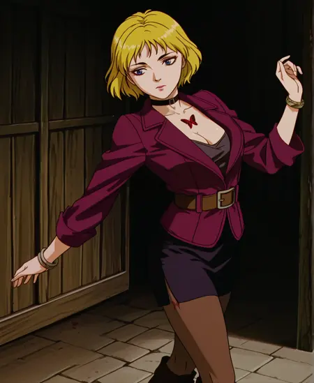 1girl, <lora:maria:0.85>, short hair, blue eyes, skirt, blonde hair, cleavage, jewelry, medium breasts, maroon jacket, pantyhose, belt, bracelet, makeup, black choker, brown knee boots, pencil skirt, butterfly tattoo on chest,