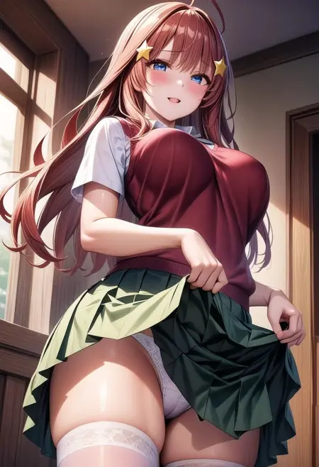 触发词:itsuki_a_xl,长发,呆毛,红发,蓝眼,大胸,星星发饰,发饰,校服,红色毛衣,背心毛衣,短袖,衬衫,白衬衫,绿色裙子,百褶裙,白袜,过膝袜,乐福鞋,深棕色乐福鞋,