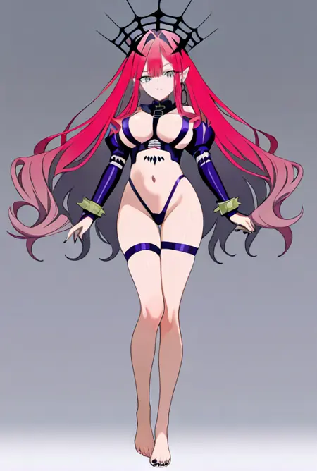 large breasts, sith2nddef, bare shoulders, bondage, detached sleeves, revealing clothes, bracelet, spiked bracelet, navel, underwear, black panties, thigh straps, barefoot, black nails,