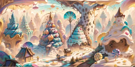 Path, road, forest, winding path, valley, flower, Chocolate bar, Rainbow, Sprinkles, Whipped cream, strawberry, cherry, chocolate sprinkles, spiral tree, spiral tower, stairs, desert, stairs, desert, dessert, house made of candy, house, building, candy town, candy village, architecture, arabian architecture, bridge, moon bridge, candy cane forest, bamboo, bubblegum forest, ice cream mountain, chocolate hill, honey, sand, ocean, rainbow terrain, upside-down, snow, snowing, snowy roof, etc.