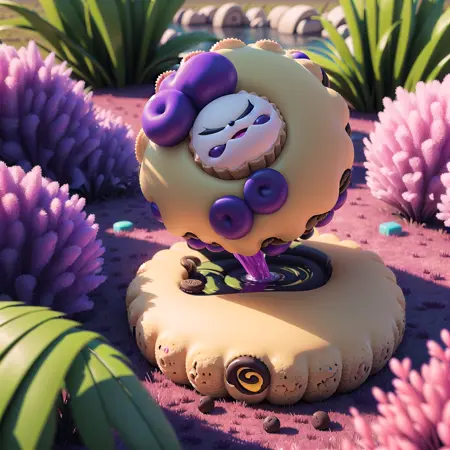 Full background, 2d (or) 3d, claymation, stop motion, tilt shift, outdoors, candy, fruit, food, food focus, sugar, sweets, scenery, landscape, day, night, colorful, shiny, reflection, shadow, painting (<- or put in negative), panoramic view, wide shot, Blurry background, blurry foreground, science fiction, fantasy,