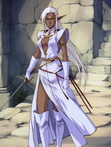 의상: 어깨 노출 민소매 상의, 흰 상의, 목걸이, 벨트, 라피에르, 무릎 위 부츠, 흰 부츠