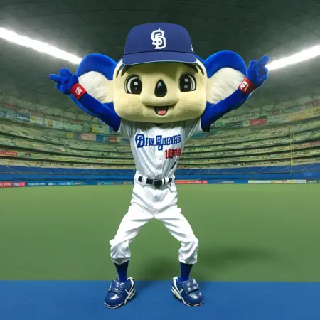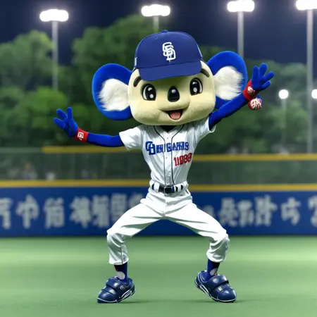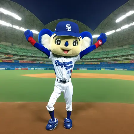 doalaH, mascot, baseball uniform, clothes writing, baseball cap, open mouth, gloves, smile, blue footwear, belt, white pants