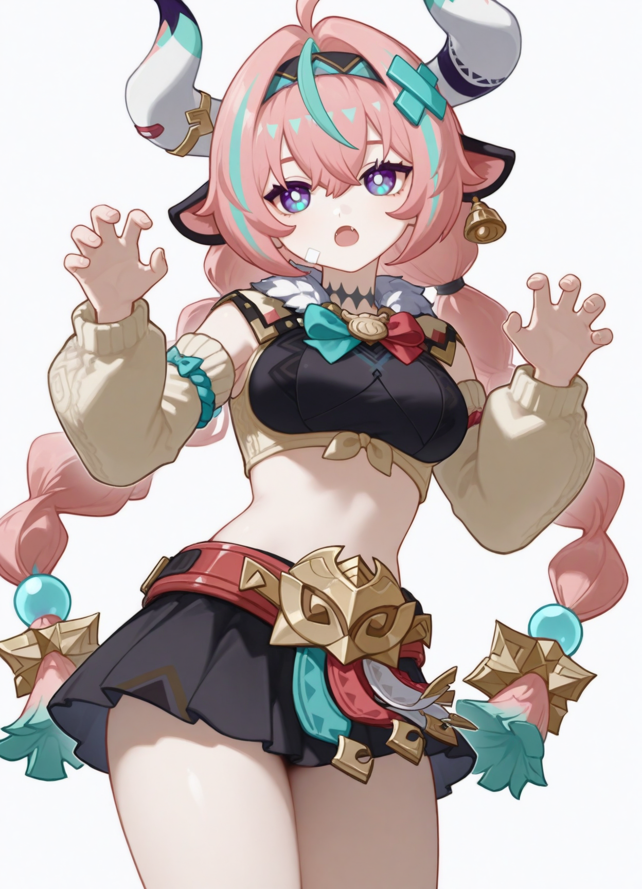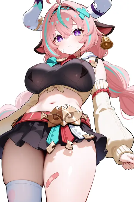 varesa \(原神\),1girl,角,单人,胸部,紫色眼睛,多色发,裙子,肚脐,粉发,长发,动物耳朵,尾巴,过膝袜,牛耳,条纹发,黑裙,虚拟YouTuber,创可贴,牛仔女孩,露脐装,呆毛,双马尾,看着观众,牛尾,大胸部,单侧过膝袜,牛角,白色过膝袜,百褶裙,超短裙,铃铛,腿上创可贴,披萨片,大腿,露脐上衣,蝴蝶结,脱袖,腰带,珠宝,全身,