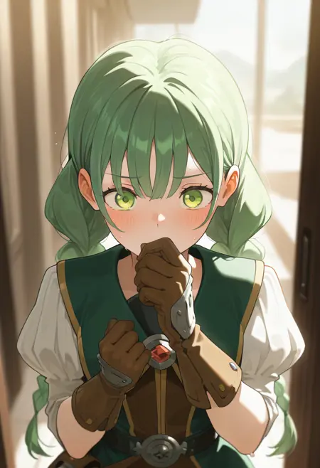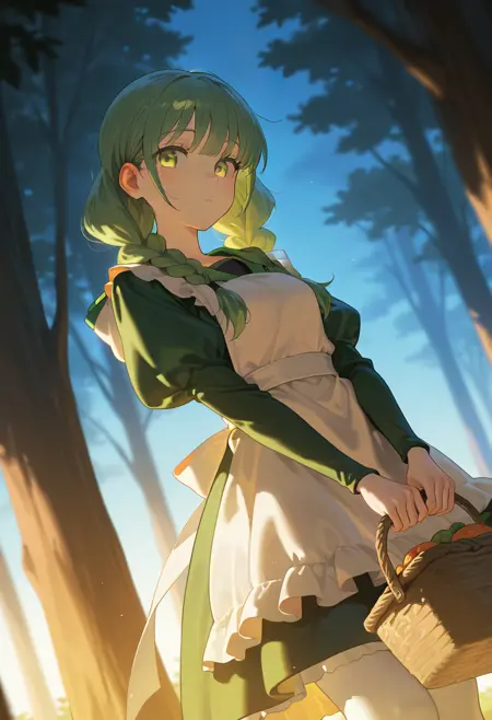 彼女の外見のタグ: 1girl, solo, long hair, green eyes, collarbone, braid, green hair, twin braids, medium breasts, hair bow