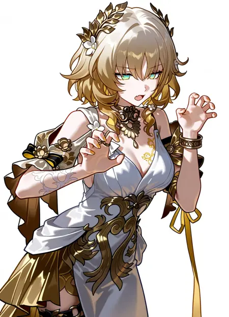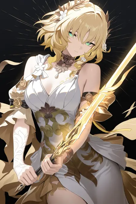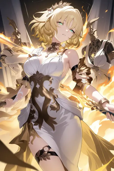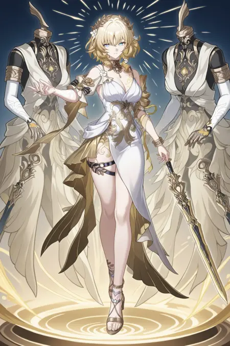 aglaea \(honkai star rail\),1girl,blonde hair,solo,breasts,dress,green eyes,hair ornament,high heels,white dress,flower,cleavage,large breasts,full body,short hair,thigh strap,sandals,looking at viewer,weapon,hair flower,sword,chest tattoo,medium hair,jewelry,detached sleeves,bracelet,laurel crown,