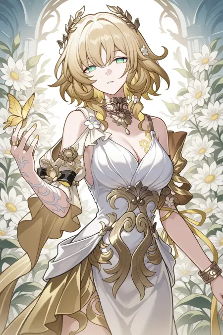 aglaea \(honkai star rail\),1girl,blonde hair,white dress,solo,green eyes,dress,cleavage,jewelry,laurel crown,bare shoulders,chest tattoo,medium hair,colored inner hair,bracelet,multicolored hair,