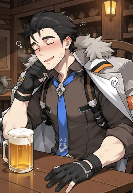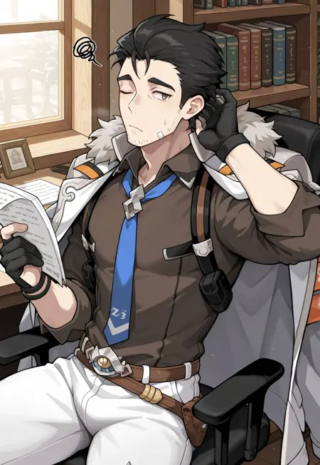 デフォルトの服:z3kh3l_wf、茶色の目、黒髪、ひげ、毛皮縁取りのコート、肩にかけたコート、シャツ襟、茶色のシャツ、青いネクタイ、部分的に指先が開いた手袋、ベルト、白いズボン、脚の装甲、装甲ブーツ