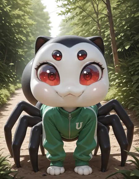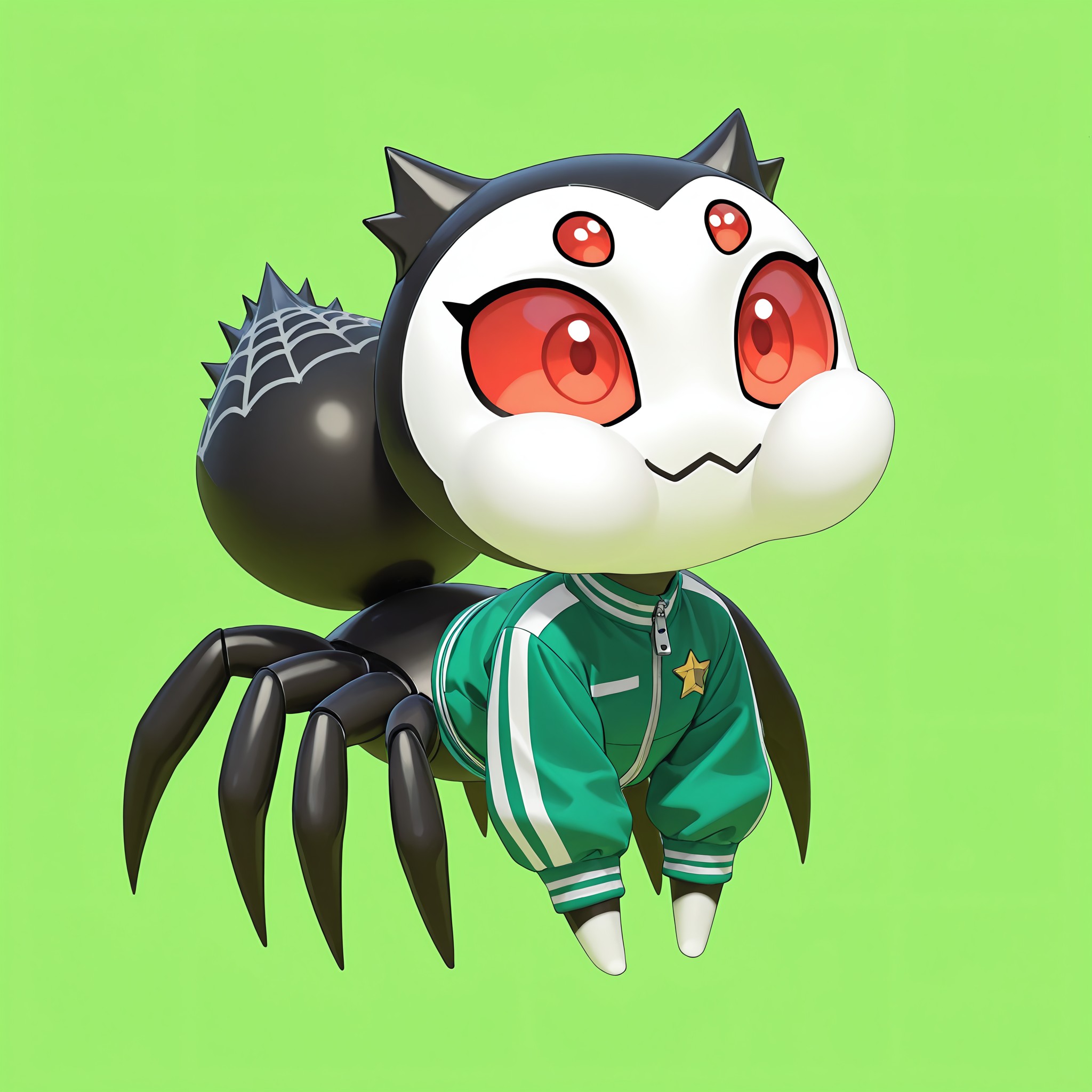 Spinny-AC, Spider, six legs, black legs with white tip, Black abdomen, large red eyes, white face, 4 eyes, White mandible on face, green jacket, little spiky ears on head