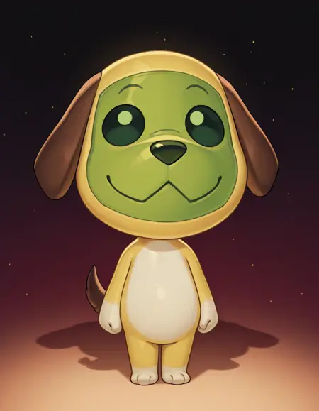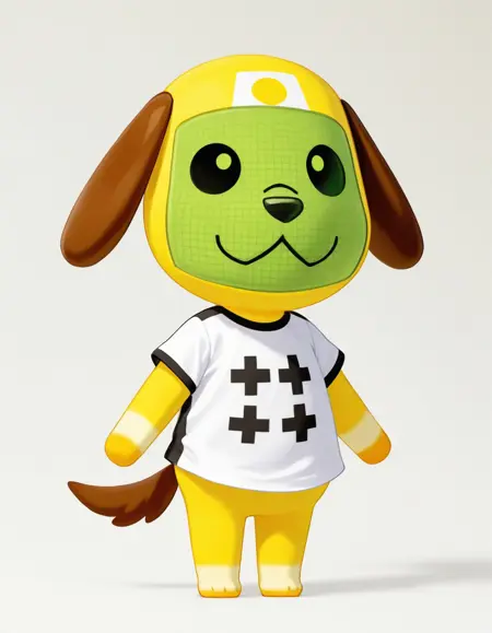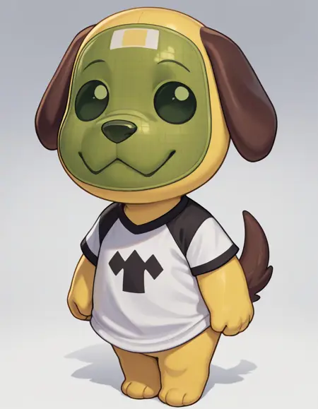 Bow-AC, dog, Yellow Skin, Green LCD face, brown tail, brown dog ears, dark yellow dog logo on forehead, barefoot, black and white checker shirt