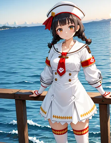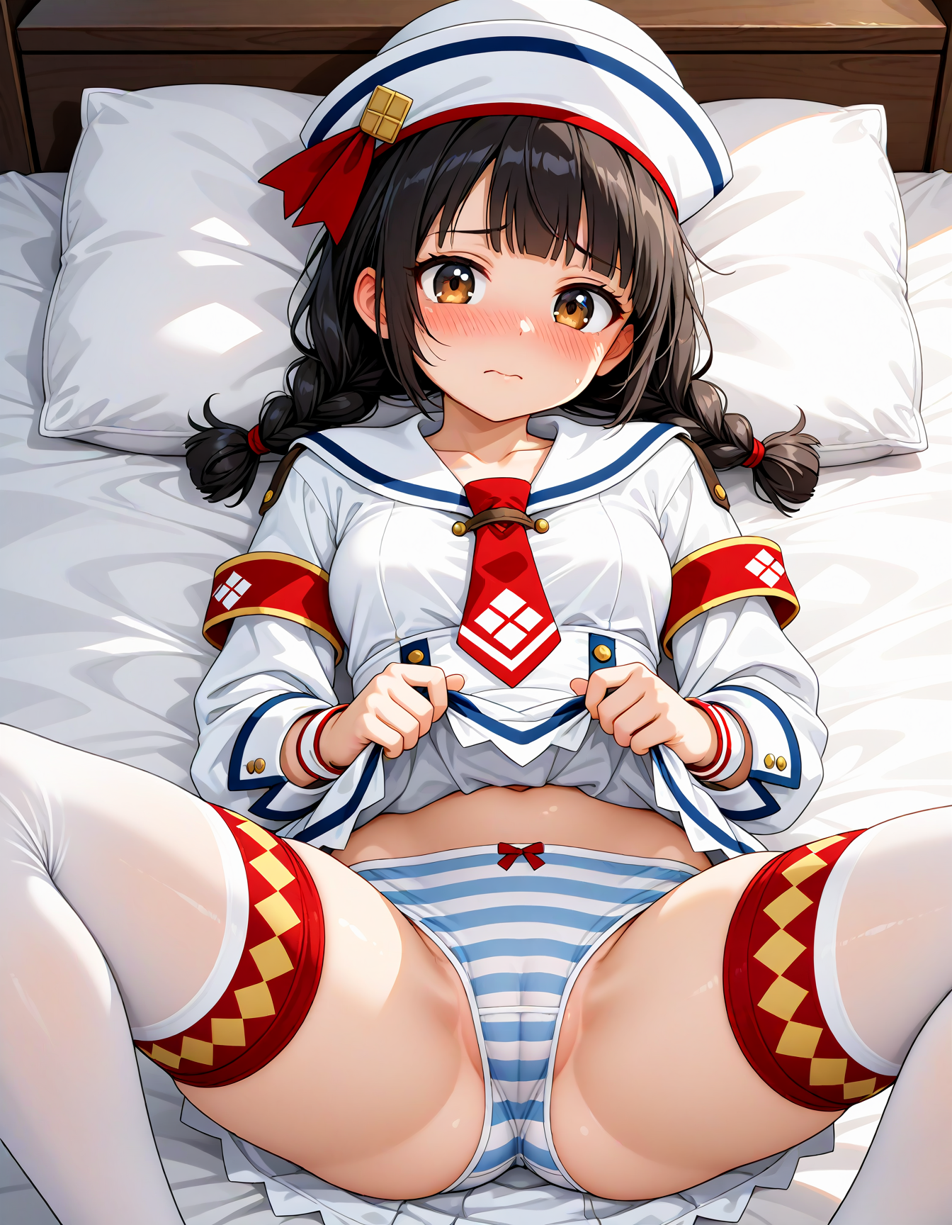 TanziaSweetheart, TanziaErina, brown eyes, black hair, twin braids, braid, dixie cup hat, white sailor collar, white skirt, red necktie, white thighhighs, long sleeves,