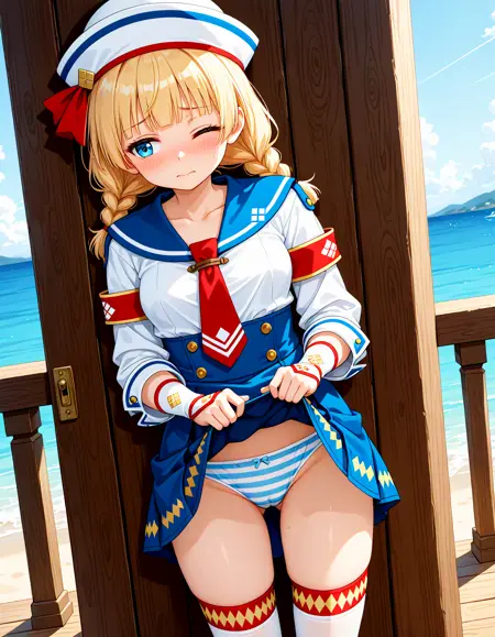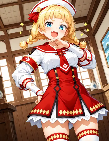 TanziaSweetheart, TanziaLaura, blue eyes, blonde hair, twin braids, braid, dixie cup hat, red sailor collar, red skirt, red necktie, white thighhighs, long sleeves,