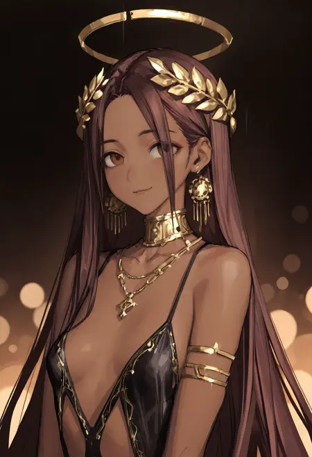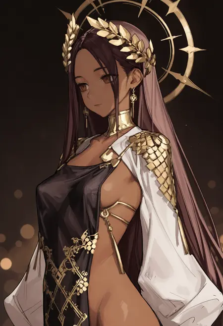 brown hair, long hair, brown_skin, detail pupil, smile, laurel crown, gold jewelry,