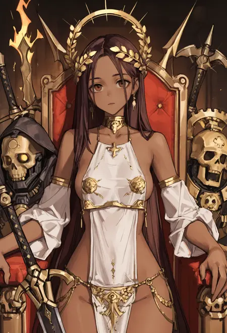 1girl, solo, emperor gir, brown hair, long hair, brown skin, detail pupil, expressionless, laurel crown, gold jewelry, breast curtain, gold embroidery, sideboob, no underwear, upper body, warhammer_40k \(series\), Power Claw \(Lightning Claw\), emperor's sword, golden flame, sword with flames, looking at viewer, BREAKsacred scene, throne, halo \(light\), holy radiance, golden skull decoration, machine
