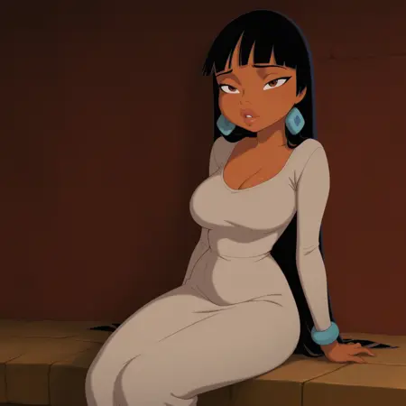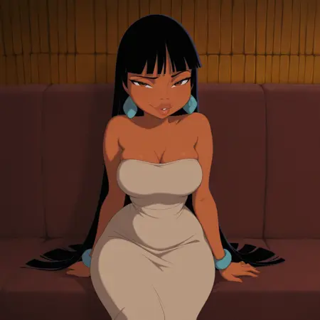 long hair, dark-skinned female, dark skin, black hair, large breasts, bangs, brown eyes, blunt bangs, thick lips