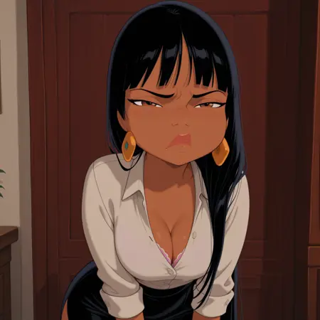 프롬프트: 라티나 소녀, 검은 피부의 여성, 앞머리, 긴 머리, 검은 머리, 갈색 눈, 넓은 골반, 세็ก시한 몸매, 탄탄한 몸매, 두꺼운 입술, 두꺼운 허벅지, 원작 스타일, 만화 스타일의 컬러링, 만화 스크린캡