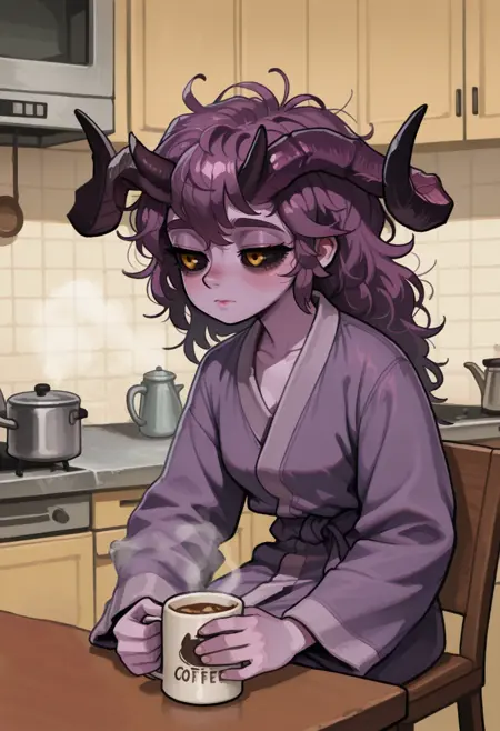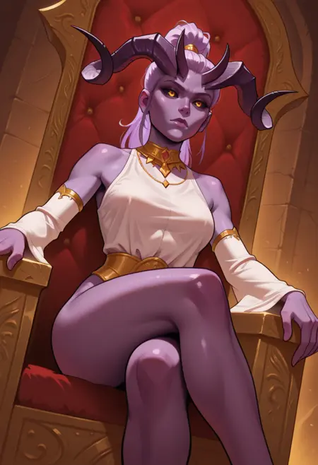 Appearance - ss-d3sd3m-illu, demon girl, black sclera, yellow eyes, horns, colored skin, purple skin, breasts, navel,