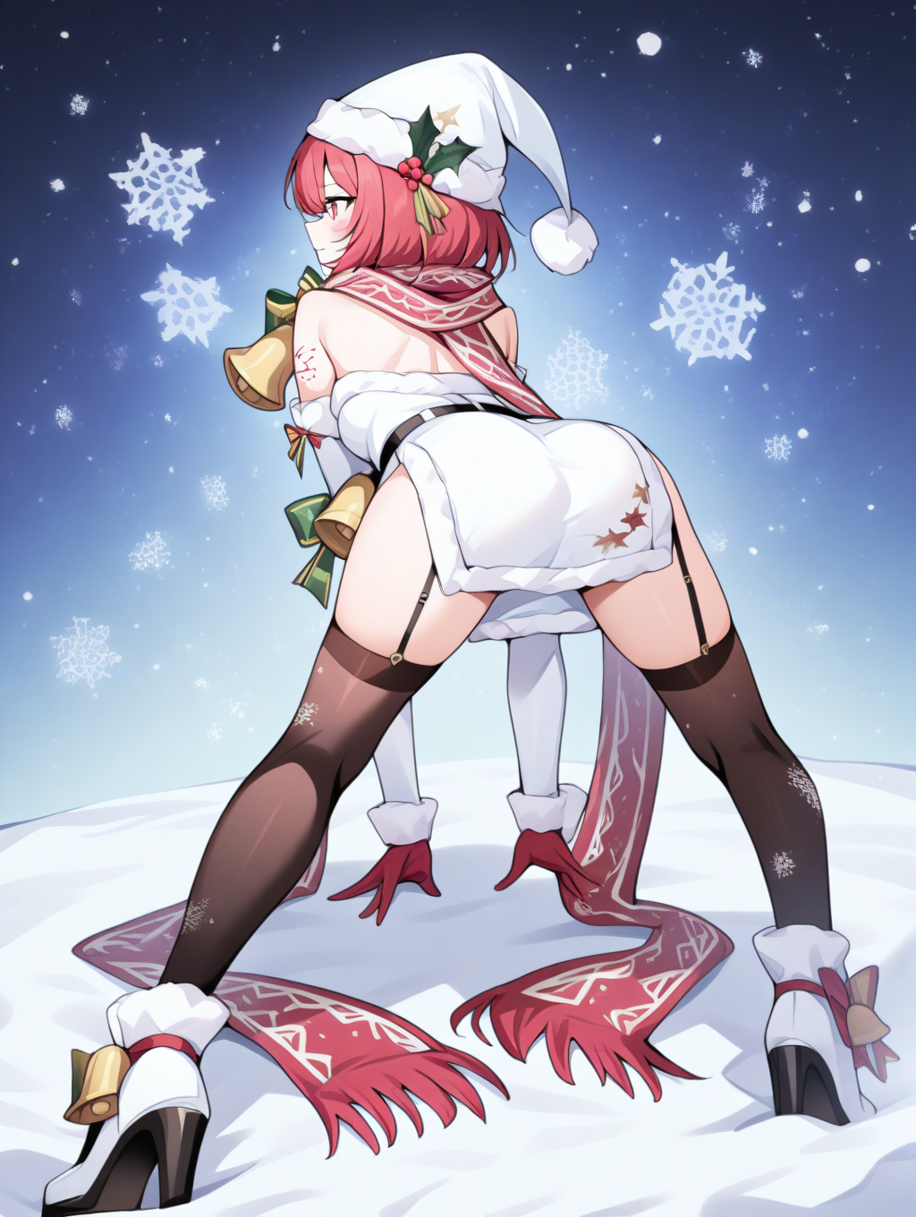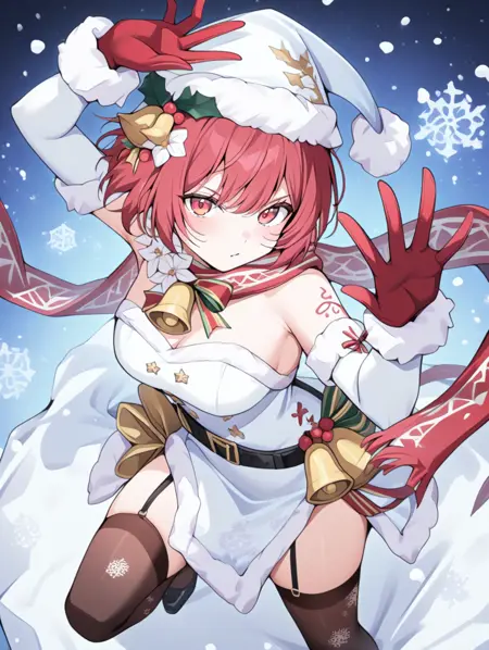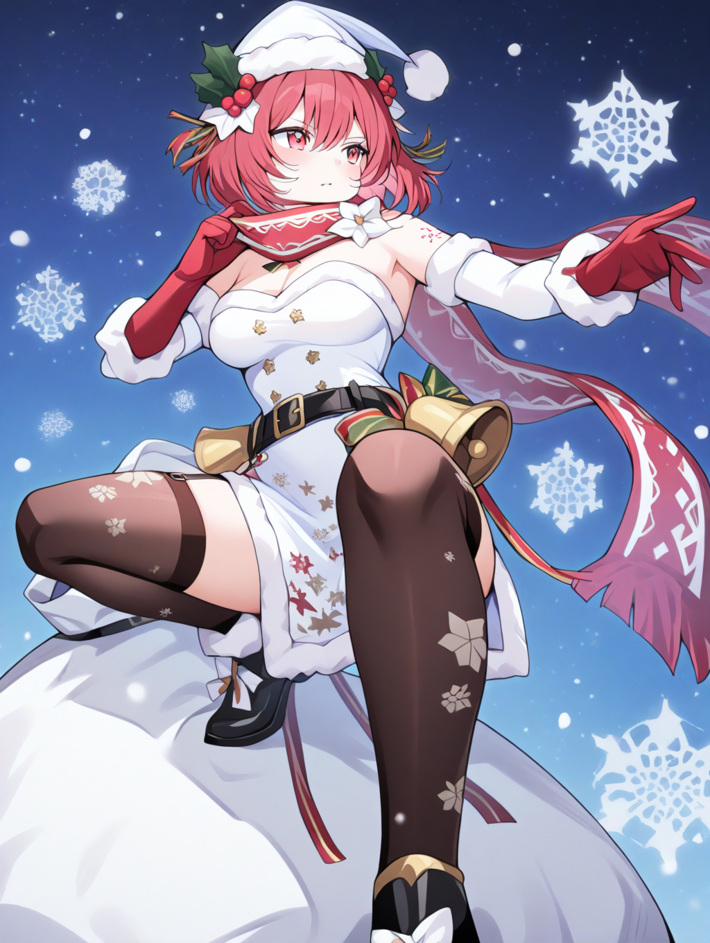 プロンプト例: huyu,solo,red hair,red eyes,short hair,hair ornament,white santa hat,strapless,white dress,fur trim,garter straps,print thighhighs,scarf,detached sleeves,bare shoulders,red gloves,side slit,bell,belt,arm tattoo,black thighhighs,shoes,