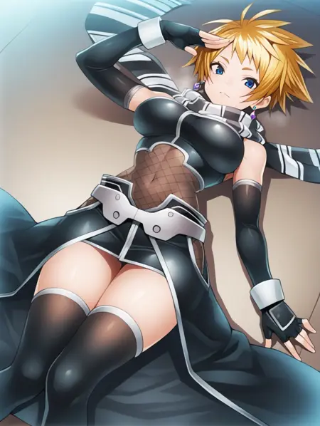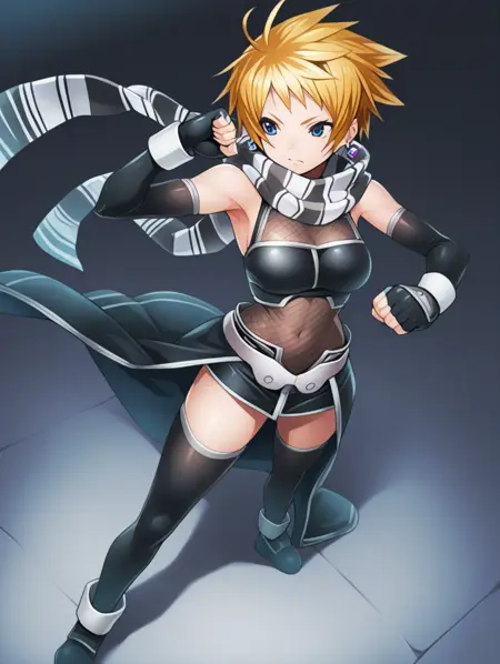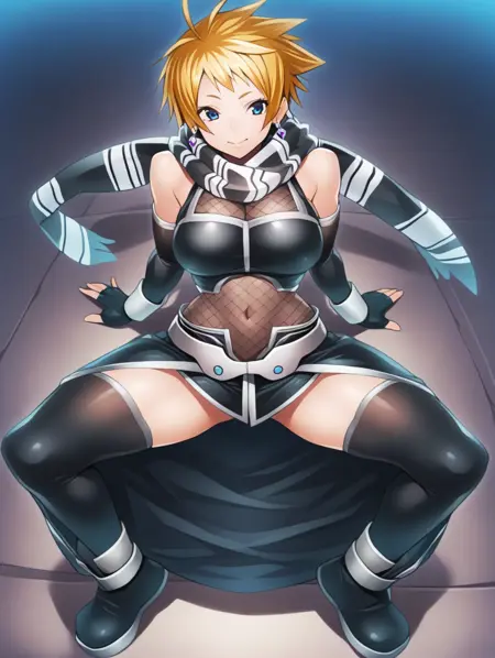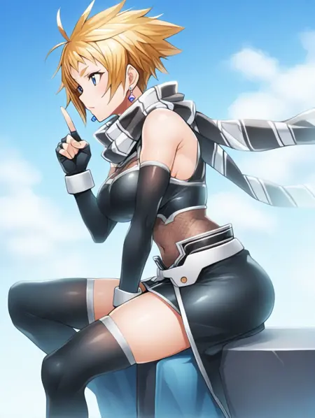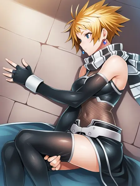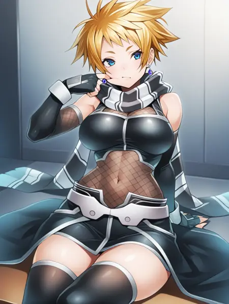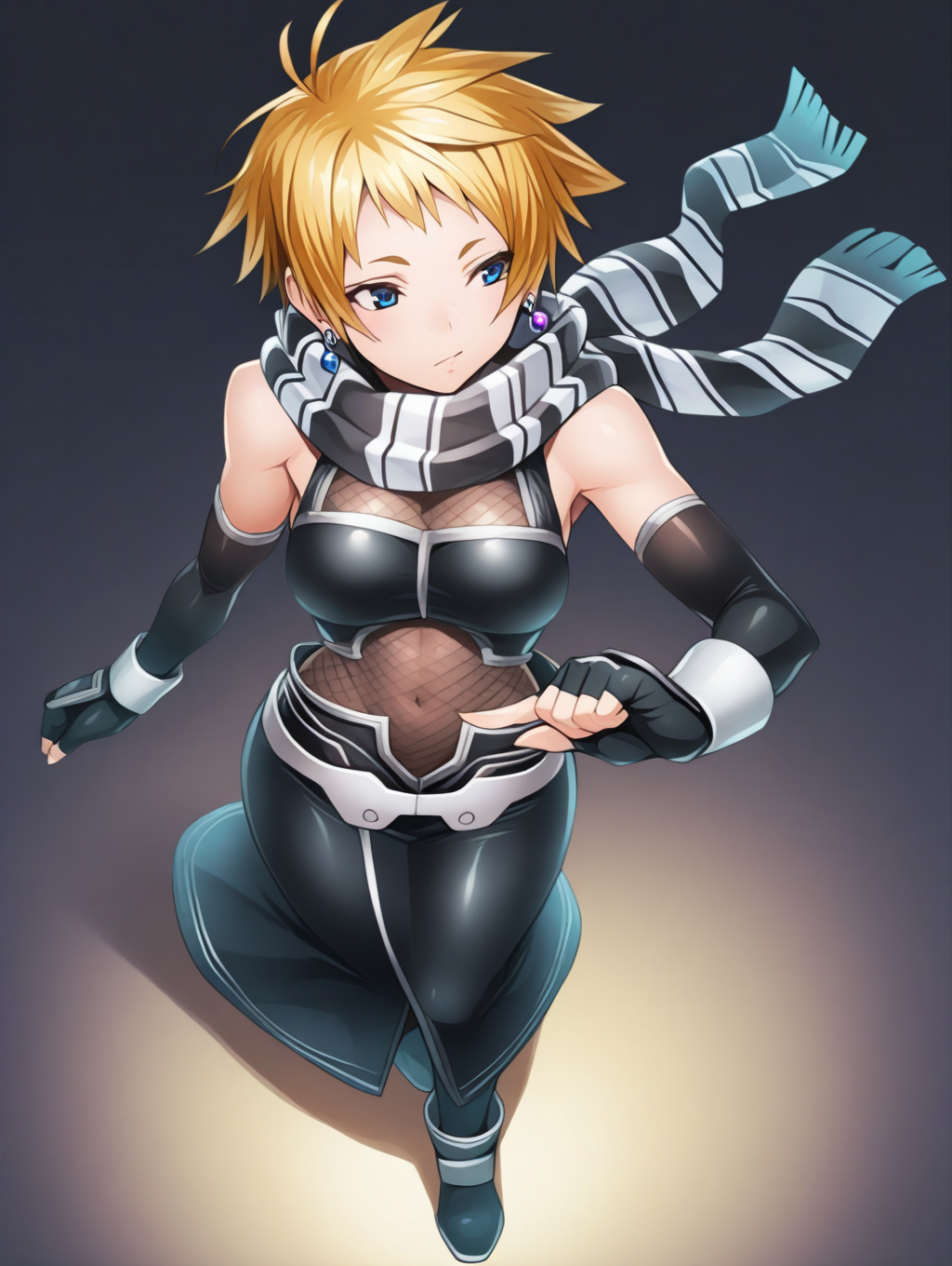 프롬프트 예시: tainebu, 금발, 스카프, 미니스커트, 검은 허벅지 긴 양말, 혼자, 바디수트, 손가락 없는 장갑, 팔꿈치 장갑, 귀걸이, 파란 눈, 배꼽 가린 상태, 피시넷, 긴 치마,