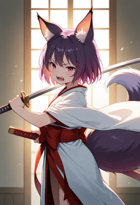 IzunaCute, 短发, 紫发, 动物耳绒毛, 狐尾, 动物耳朵, 狐娘, 竖瞳, 渐变发色, 粉色眼睛