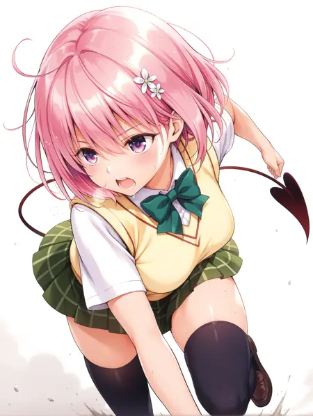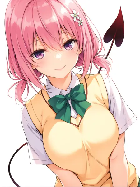 トリガーワード:momo, pink hair, purple eyes, short hair, white flower hair ornament, demon tail