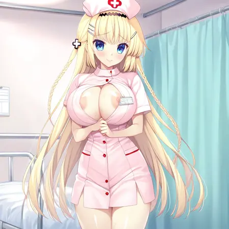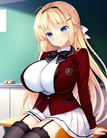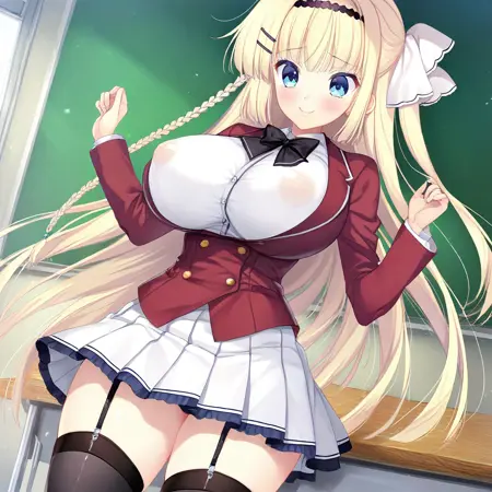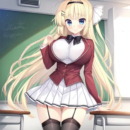 推荐提示词:Kazuha Kuonji,蓝眼睛,金发,长发,发带,发夹,发饰,辫子,
