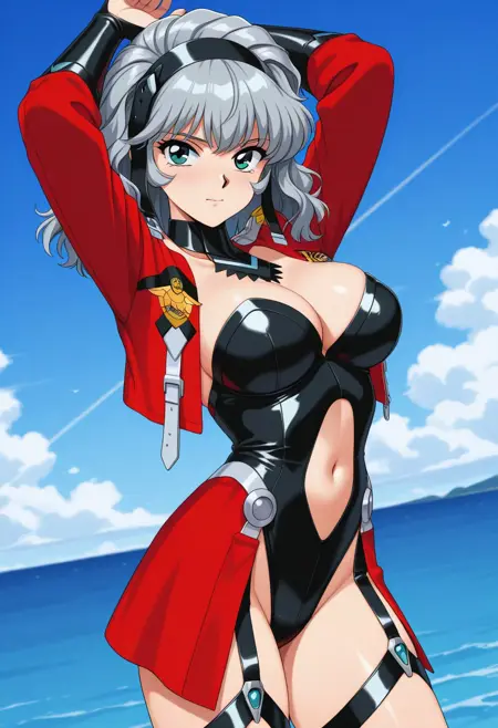 detached collar, cleavage, strapless, red jacket, belts, gold emblem, black bridal gauntlets, black highleg leotard, navel, navel window, red skirt, garters, black high heels,
