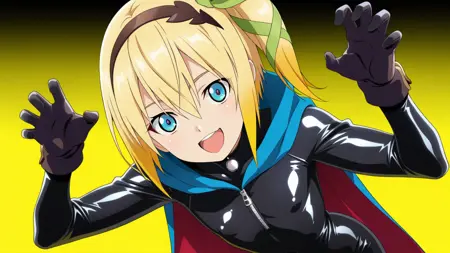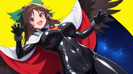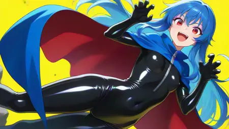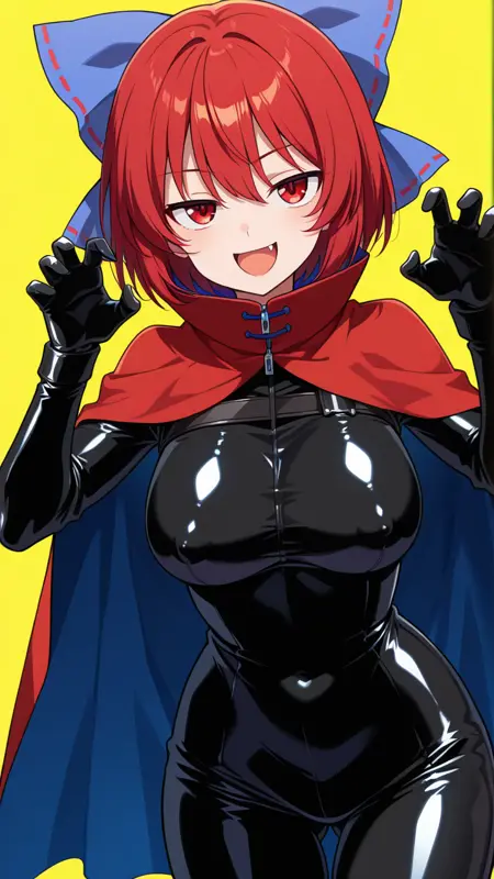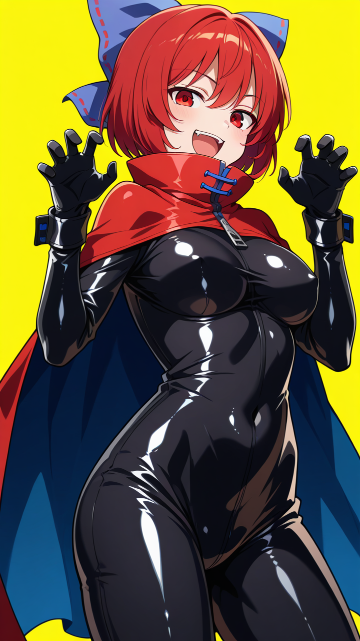 sekibanki, 빨간 눈, 빨간 머리, 단발, 리본 장식 리본, 파란 리본, 파란 망토, 이색 망토, 라텍스 바디수트, 검은 바디수트, 양면 망토, 빨간 망토, 라텍스, 바디수트, 지퍼, 몸에 붙는, 배꼽 가림, 젖가리 가림, 검은 장갑, 노란 배경,