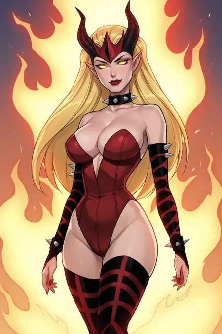Demon Queen: horns, pointy ears, yellow eyes, glowing eyes, fire, spikes, choker, bare shoulders, deep cleavage, red bodysuit, elbow gloves, thighhighs, thigh boots