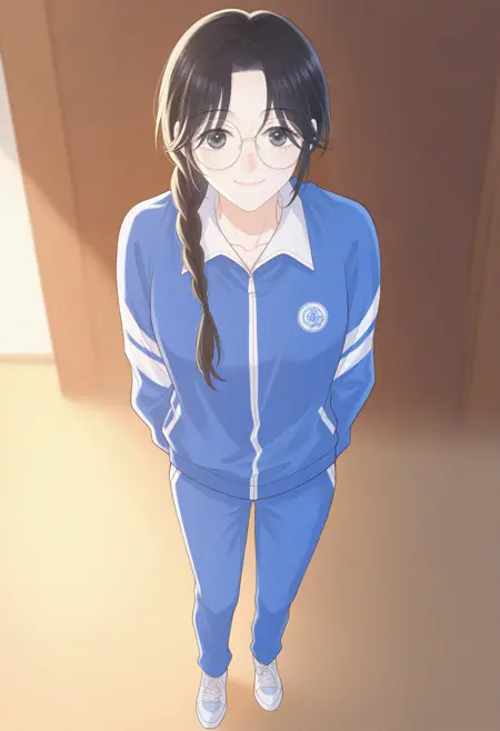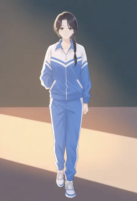 track suit, pants, blue pants, jacket, long sleeves, hair over shoulder, track jacket, footwear,
