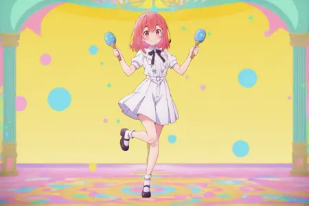 maracas,holding,standing on one leg,hands up,を入れるとそれっぽく再現できると思います。