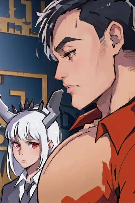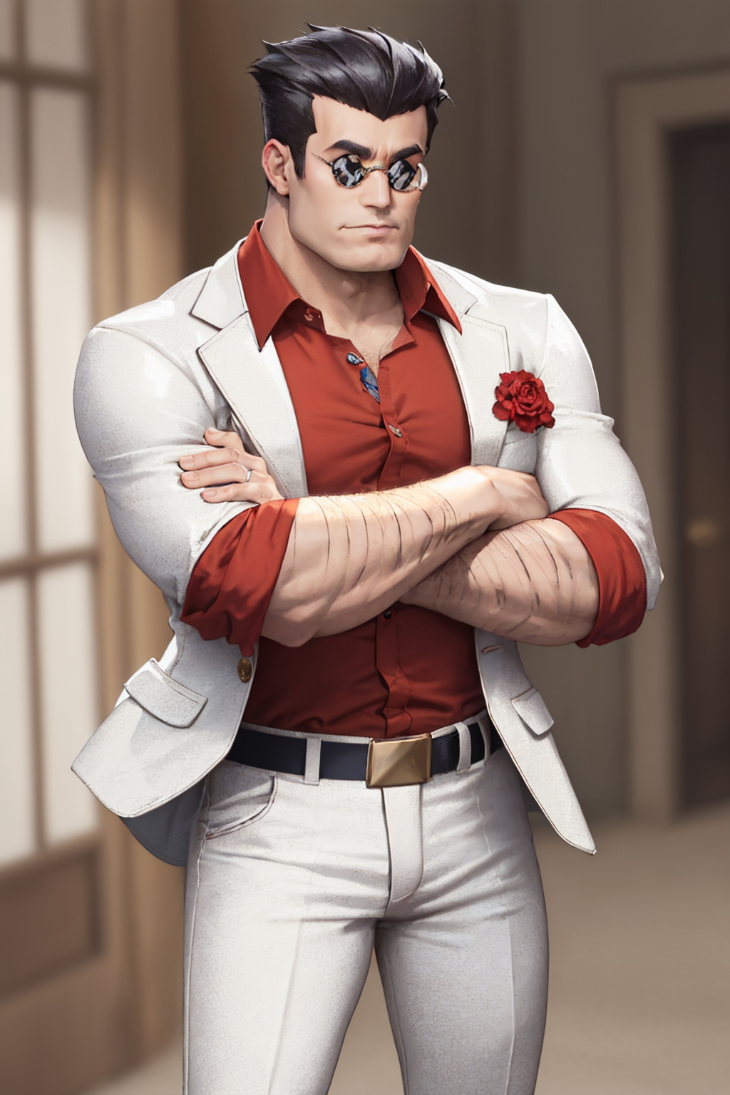 Default Outfit: sunglasses, white jacket, red shirt, collared shirt, sleeves rolled up, white pants
