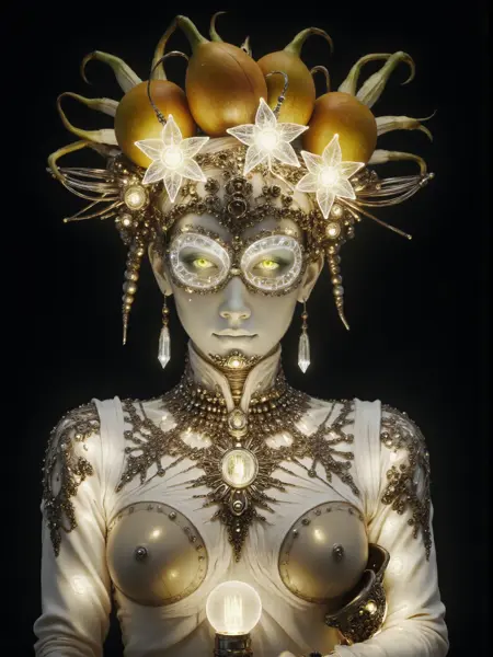 ethereal(エーテリアル)、intricate(繊細)、white(白)、image(画像)、detailed(詳細)、glowing(発光)、futuristic(未来志向)、adorned(装飾された)