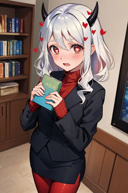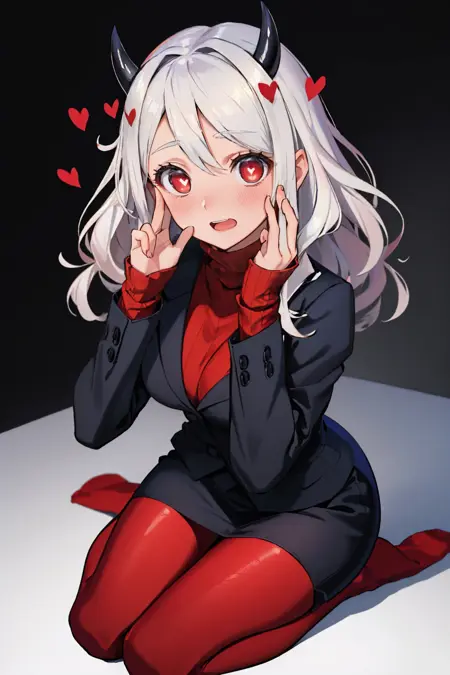 默认服装: 正式,黑色夹克,红色毛衣,高领,袖子过手腕,黑色裙子,红色丝袜