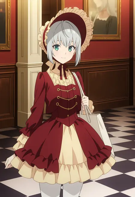 主要な衣装2つ:グレーのマント(夏用)&グレーのケープ(冬用)+赤いドレス