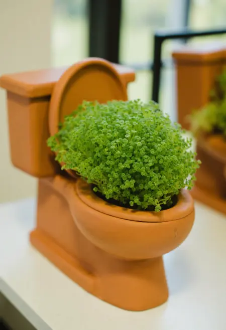 プロンプト:陶土の**(対象)**を写した写真。豊かで鮮やかな緑の植物で飾られている。
