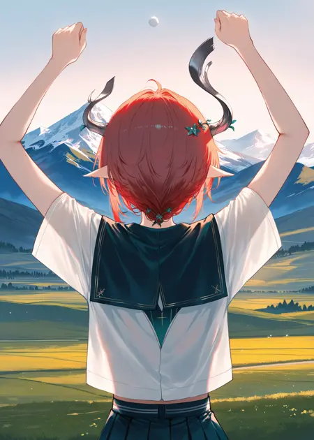 (自由服装):ILciaccona,肩部静音标记,不对称角,红发,短发,尖耳,发饰,绿眼,灰色角,眼下有痣