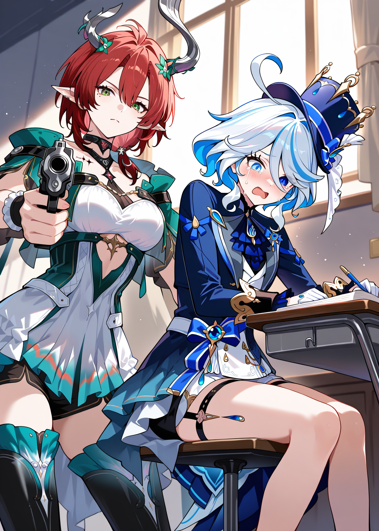 (原服装):ILciaccona,肩部静音标记,不对称角,红发,短发,尖耳,发饰,连衣裙,大腿靴,绿眼,过膝袜,灰色角,眼下有痣