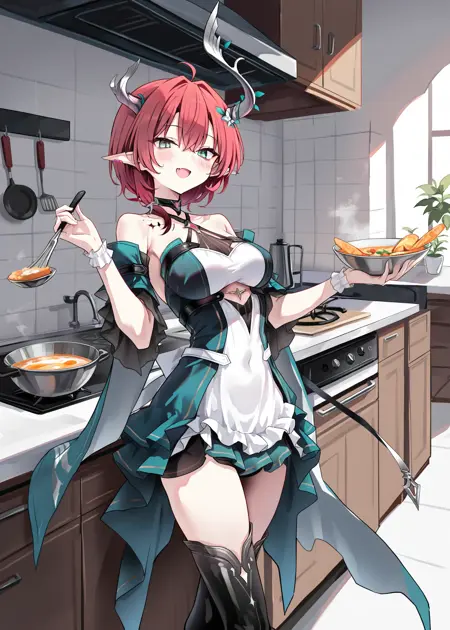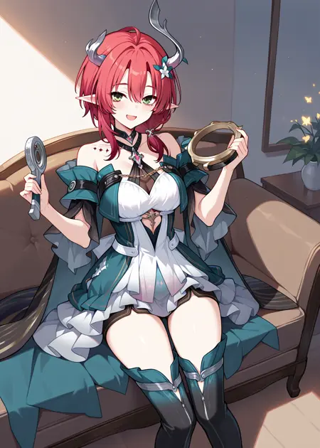 (기본 복장): ILciaccona, 어깨의 테세트 마크, 비대칭 뿔, 붉은 머리카락, 단발, 뾰족한 귀, 머리 장신구, 드레스, 허벅지 부츠, 녹색 눈, 허벅지 양말, 회색 뿔, 눈 밑 주근깨