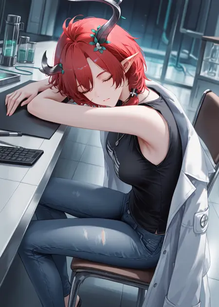 (free outfit): ILciaccona, tacet mark at shoulder, asymmetrical horns, red hair, short hair, pointy ears, hair ornament, green eyes, grey horn, mole under eye