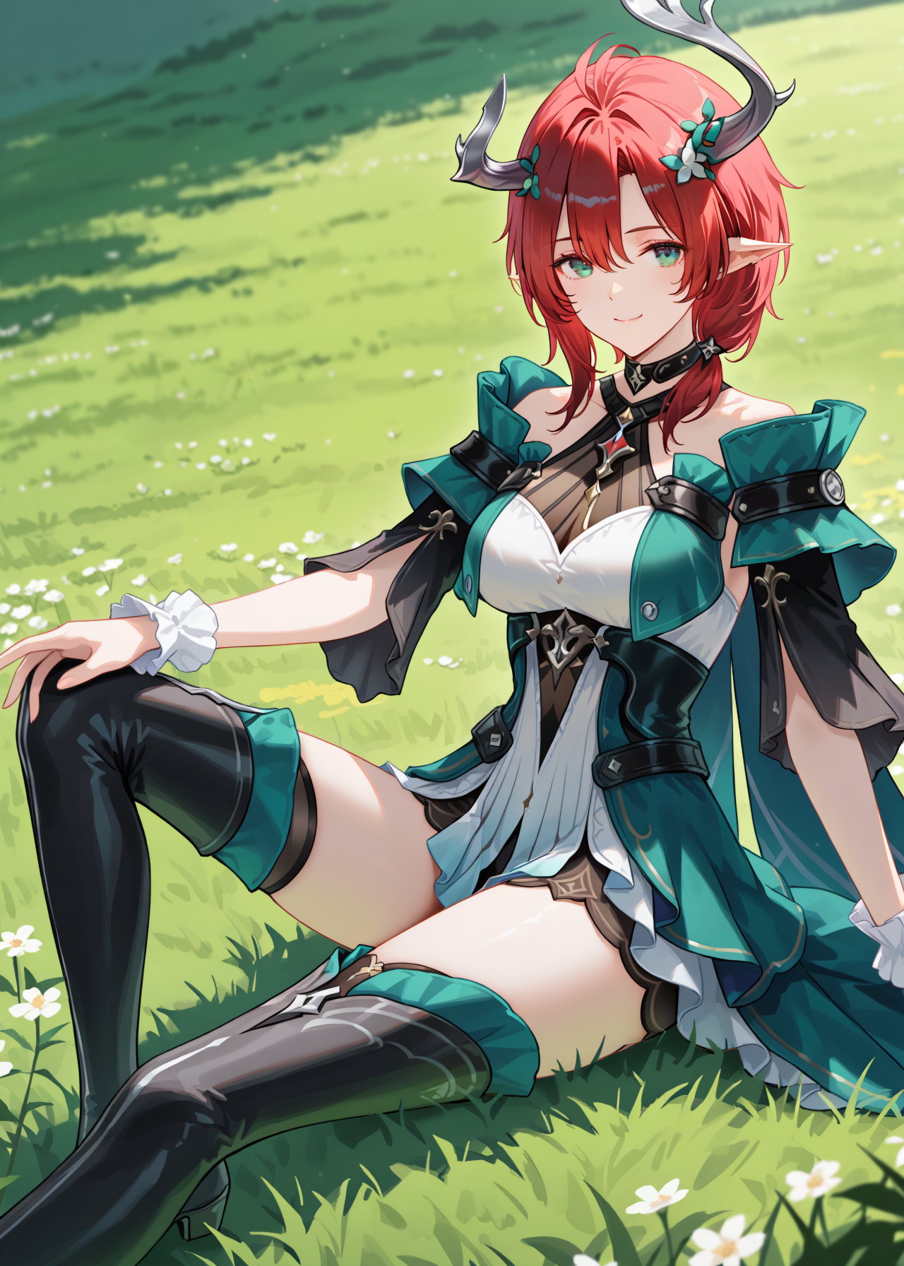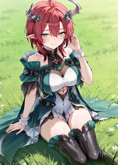 (original outfit): ILciaccona, tacet mark at shoulder, asymmetrical horns, red hair, short hair, pointy ears, hair ornament, dress, thigh boots, green eyes, thighhighs, grey horn, mole under eye