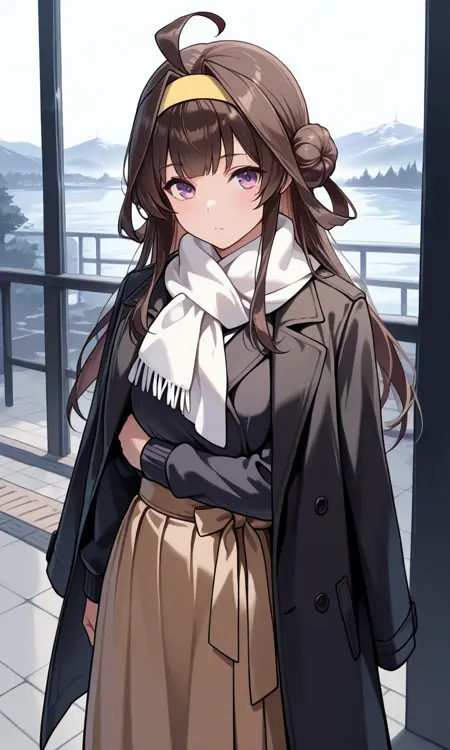 情人节服装: kongouvalKC, 长发, 裙子, 天线辫, 发带, 发髻, 围巾, 毛衣, 外套, 双发髻, 长裙, 棕色裙子, 黑色外套, 白色围巾, 外套搭在肩上