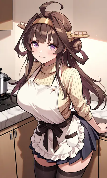 烹饪服装: kongoucookKC, 长发, 裙子, 天线辫, 发带, 黑色过膝袜, 发髻, 围裙, 毛衣, 双发髻, 头饰, 罗纹毛衣,
