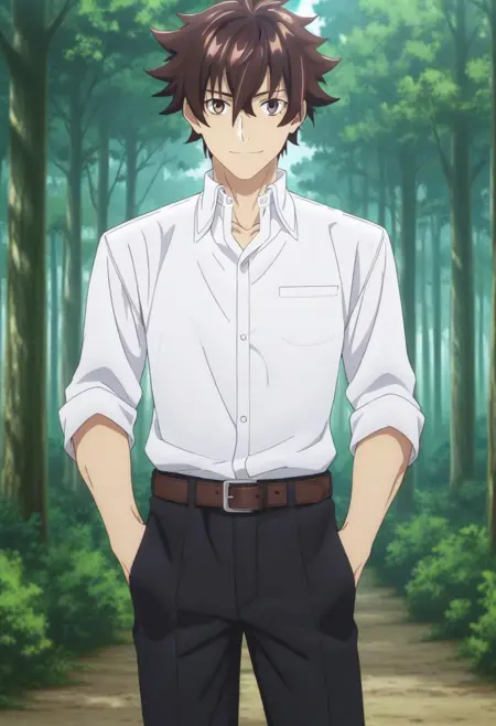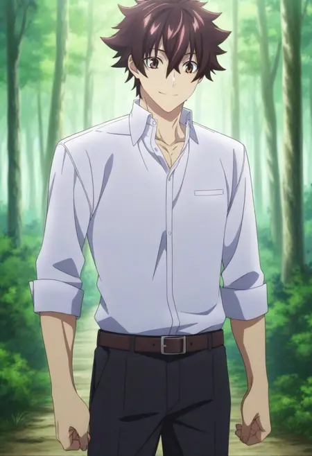 Yuuya Tenjou, brown hair, brown eyes, white collared shirt, rolled sleeves, tucked in shirt, belt, black pants