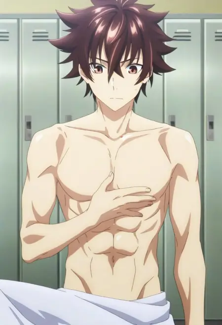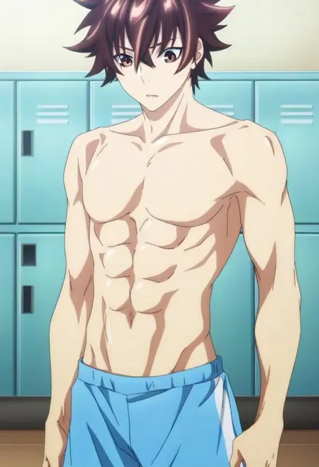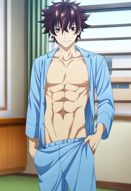 Yuuya Tenjou, brown hair, brown eyes, blue shirt, unbuttoned shirt, blue pajamas