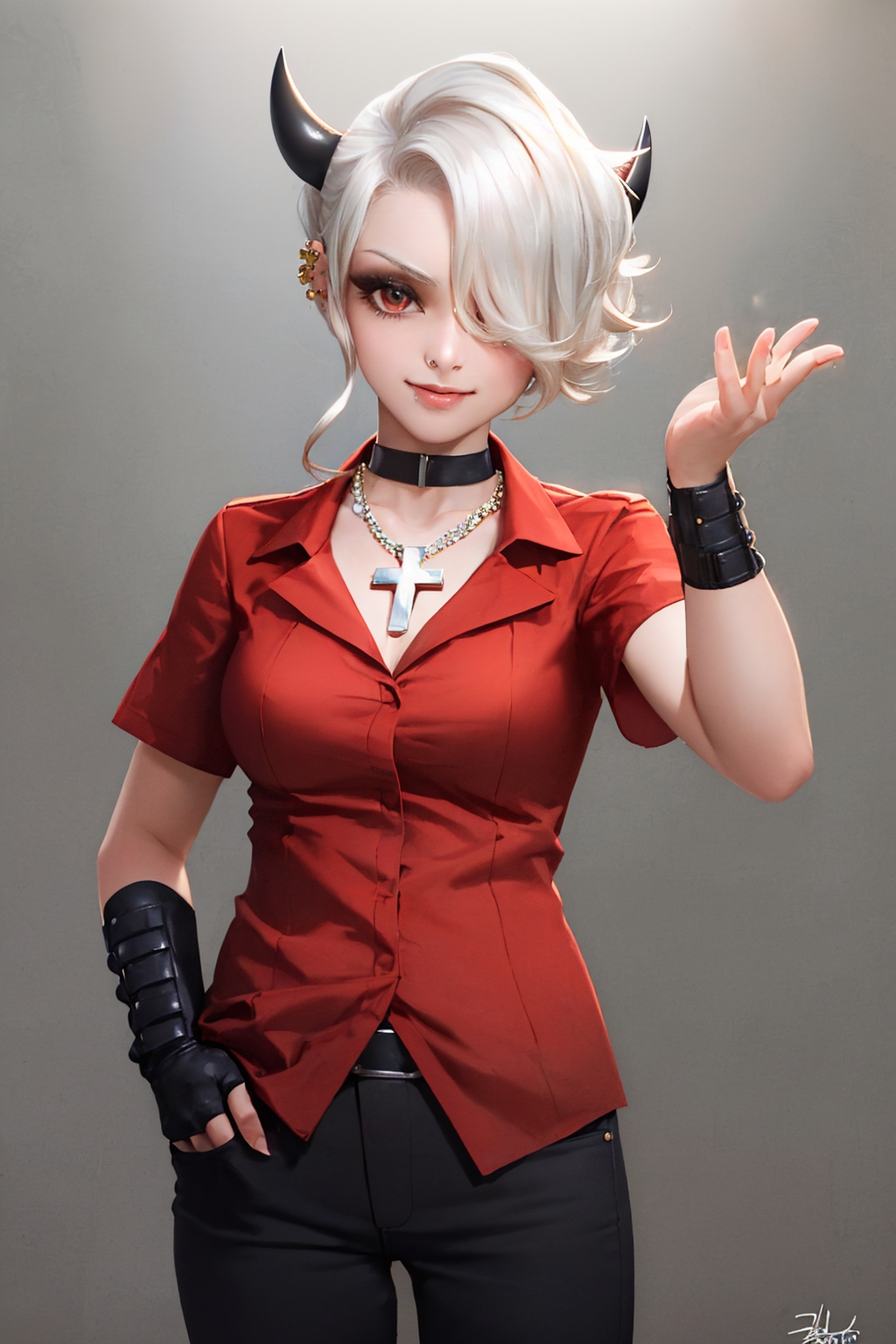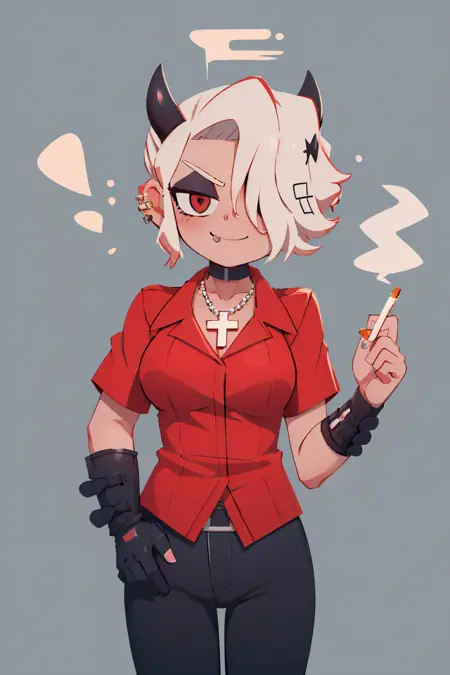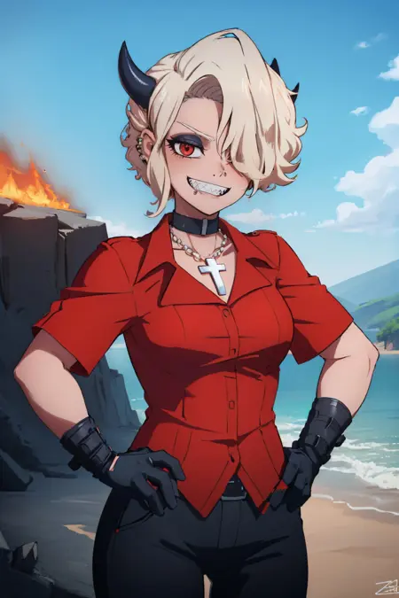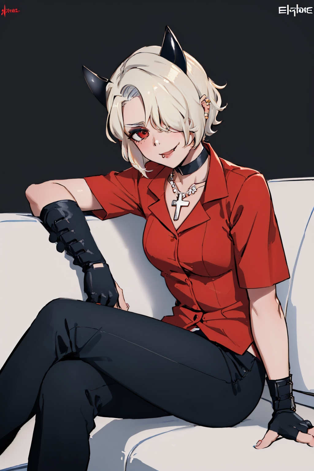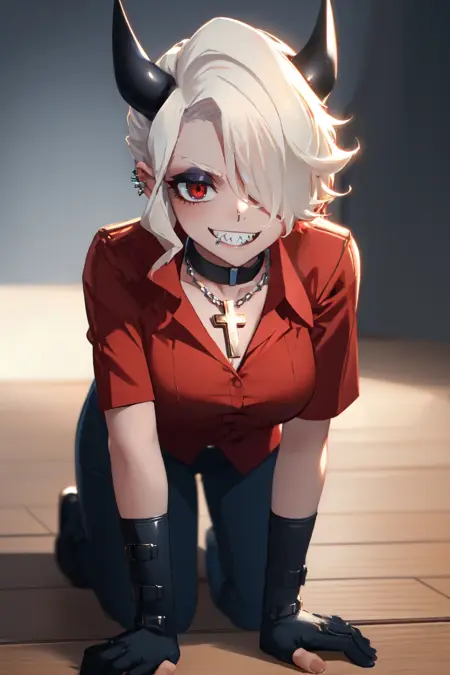 デフォルトの衣装: 赤いシャツ, グローブ, 黒いズボン, ピアス, チョーカー, クロスのネックレス