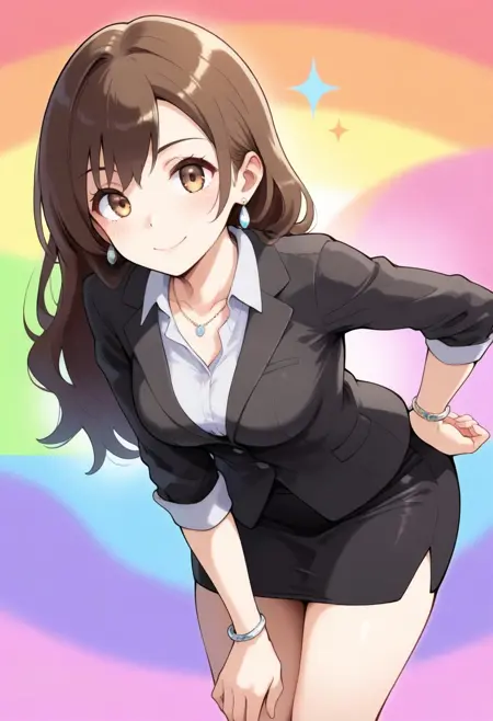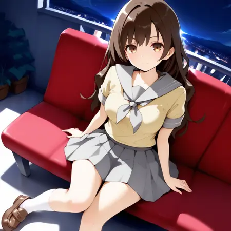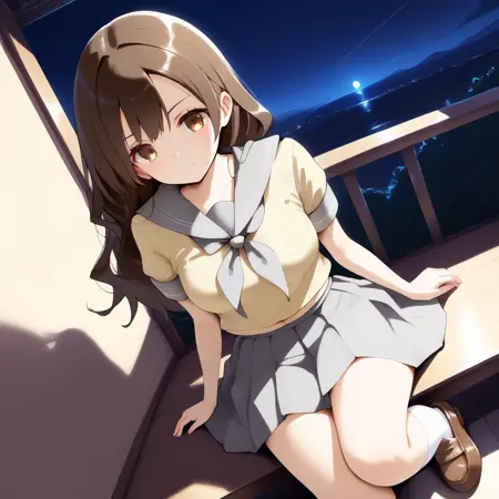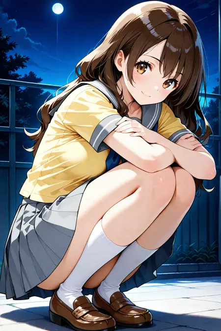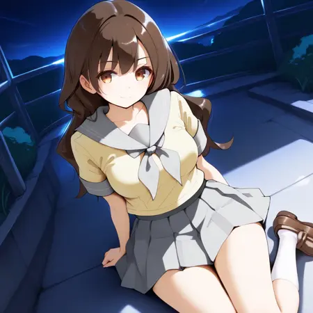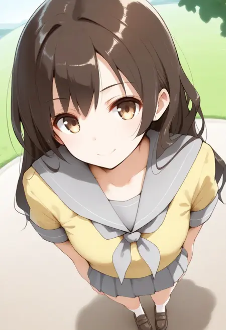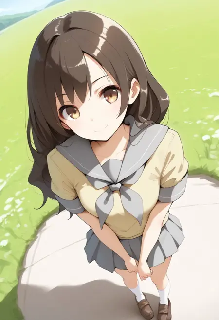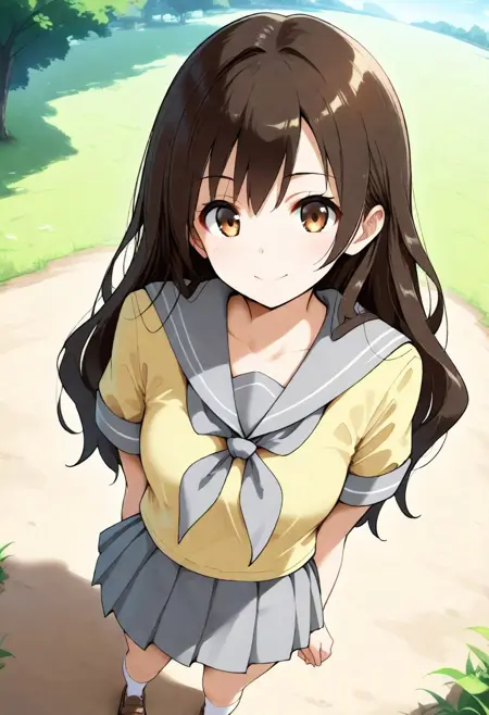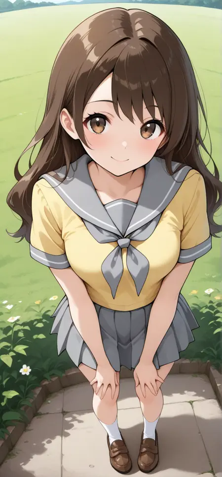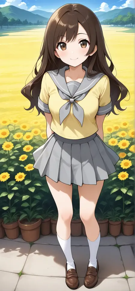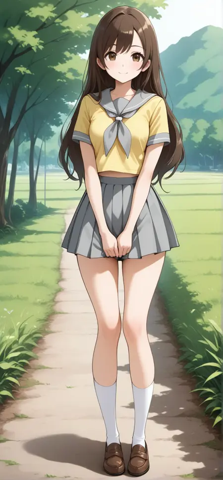 lassbw, lass \(pokemon bw\), brown eyes, long hair, brown hair, serafuku, yellow shirt, short sleeves, gray sailor collar, grey nekerchief, gray pleated skirt, white socks, loafers, brown footwear
