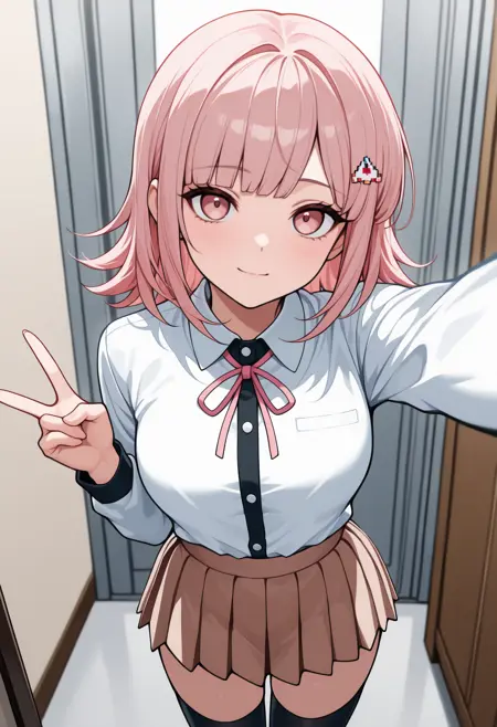 Hope's Peak Academy Uniform: nan4midr3, pink hair, spaceship hair ornament, hairclip, school uniform, brown jacket, open jacket, long sleeves, hoodie, hood down, white shirt, collared shirt, dress shirt, neck ribbon, red ribbon, brown skirt, pleated skirt, black thighhighs
